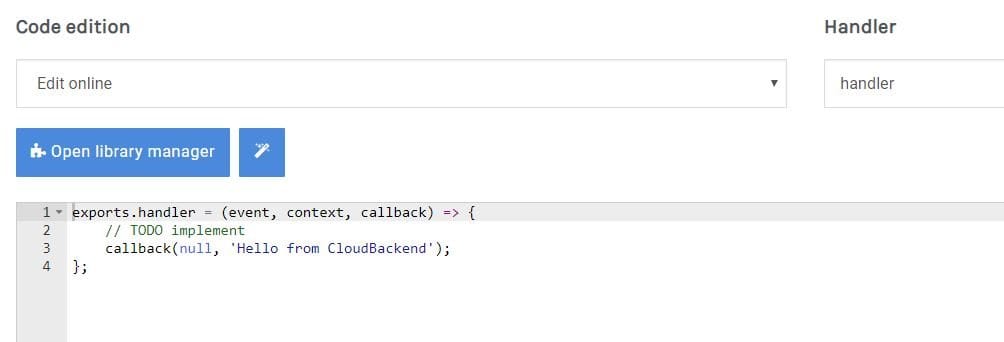 Today's API will be created in Node.js, and here are few things you should know. Node.js uses modules, which are essentially functions included in the application. Some come standard with Node, others need to be installed, which we'll do shortly, but ultimately, you can just go ahead and create your own, which is exactly the way this function begins. By default, it returns "hello from cloudbackend", but we're going to replace that for our own callback.