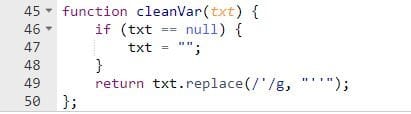Now, let's step into the handler which will be called upon every API call, and start it off with assigning variables to our values. In order to ensure that a null parameter returns an empty string, and also to ensure single quotes are escaped, hence avoiding SQL Injections, I'm going to add a function at the end of our script called cleanVar, and call it by each of my parameters.