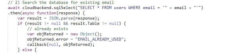 We're going to replace this query for the query that we need which is to select from our users where the email column contains our email variable. Once it ran, then we take our response and analyze it using simple logic. The response is a JSON, so once the object parsed, we check to see if it's not null, which would then mean that the email already exists. And since it does, we need to return an object with an error value of "Email already used" and then stop the execution of the account-creation process.