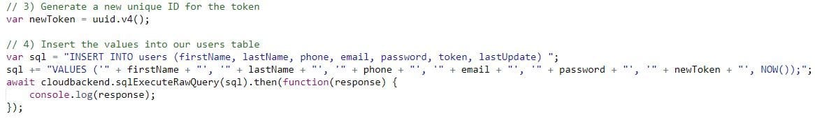 First thing we're going to do here is create our user his token ID by creating a var that will call the UUID function. And now we move on to the insertion of the variables to the table. So let's go back to the NPM documentation, and this time copy the SQL raw query.