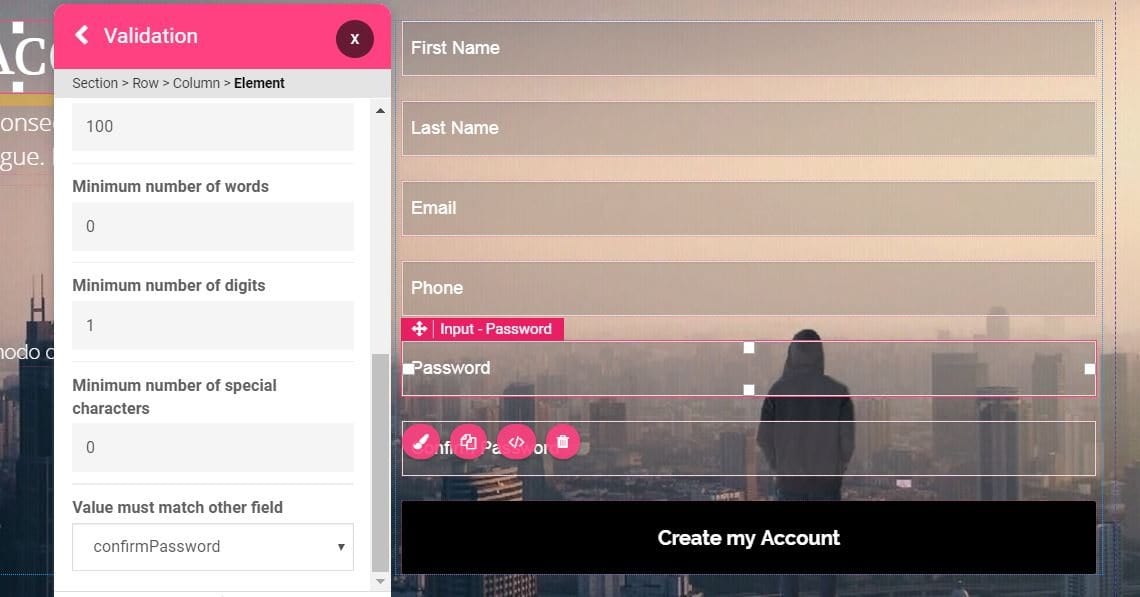 All right, let's just change some placeholders. This last one is the password confirmation field, and the way to activate that is by going to the validation of the actual password field and selecting the value match of the Confirm Password field.