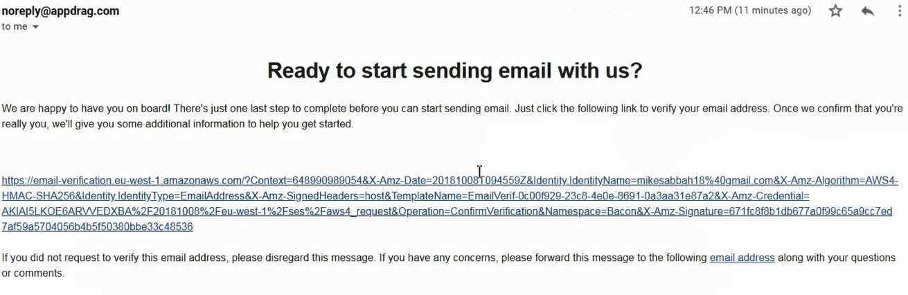 Let's put in a bogus email, and we get the error. Now, we put in the real one we added earlier, and what we get is a notification that the sender's email has not yet been verified. So I'm going to go into my inbox and open the email I just received from AppDrag. Click the link.