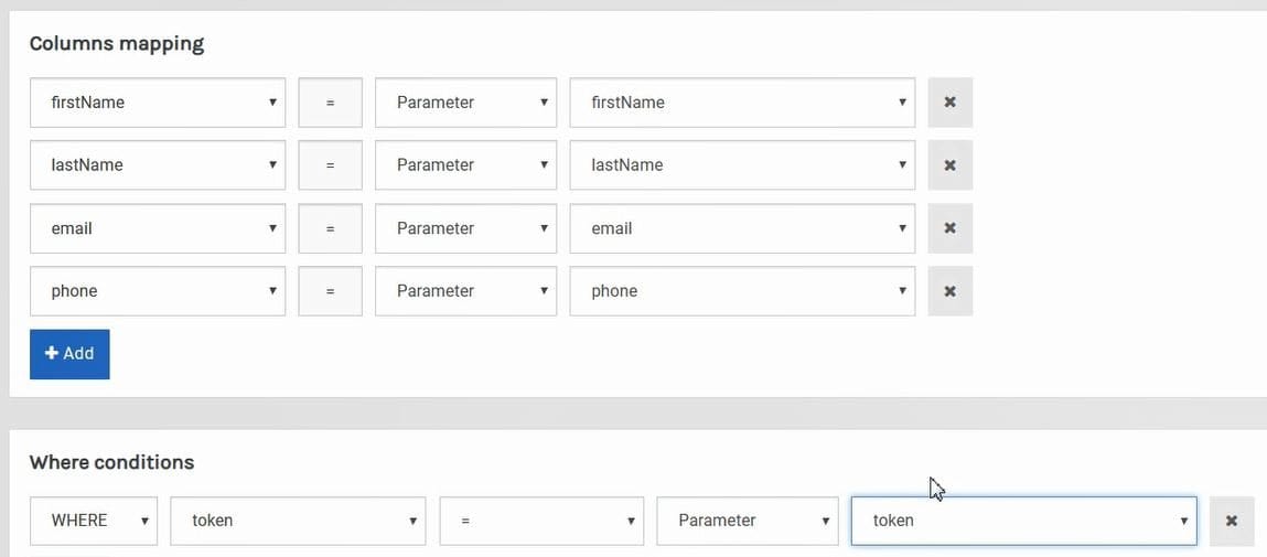 In the mapping, we will match them up with their respective parameters, and in the conditions, we simply say, where token is equal to the parameter token.
